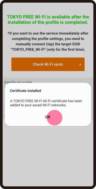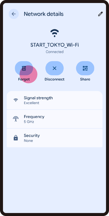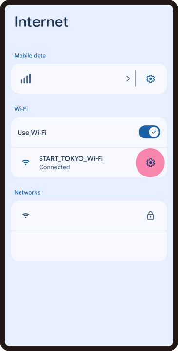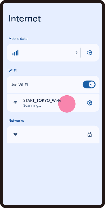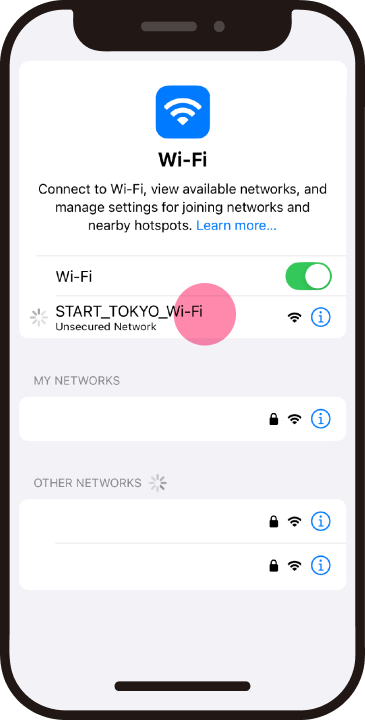 If you are near a sticker at a Wi-Fi spot but cannot connect to the Wi-Fi, it means that your device is not detecting the signal. In some cases, turning your device's Wi-Fi setting OFF once and then turning it back ON may resolve the issue. ※ This may vary depending on the device.