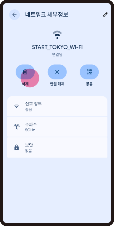 SSID「TOKYO_FREE_Wi-Fi」는 국제적인 무선 LAN 로밍 기반을 활용하여, 무선 통신 암호화에 의한 높은 보안성과 지원하는 Wi-Fi 스팟에의 자동 연결을 이용하실 수 있습니다. 지원 스팟에는 스티커를 게시하고 있습니다. (시설에 따라 스티커가 게시되지 않은 경우도 있습니다)