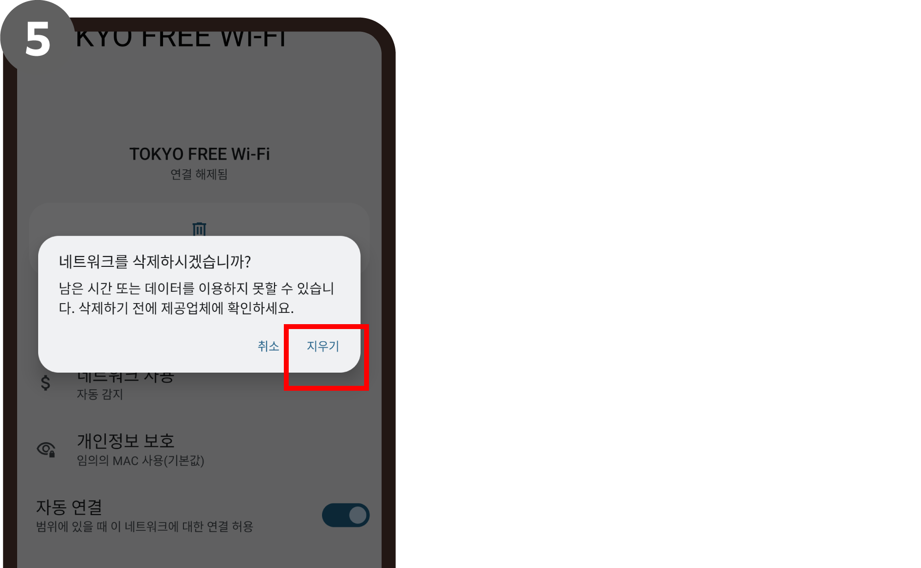 ‘설정’ > ‘Wi-Fi’ > 저장된 네트워크에서 ‘TOKYO FREE Wi-Fi’를 탭하여 ‘삭제’를 누르고 종료합니다.