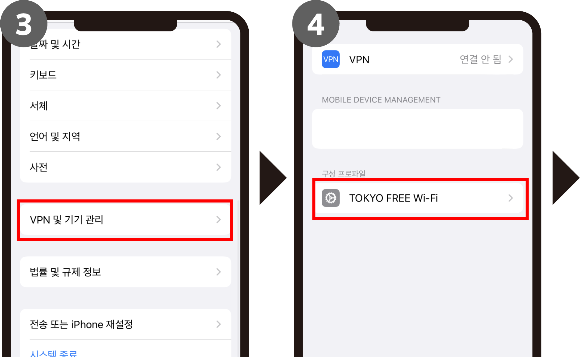 ‘설정’ > ‘일반’ > ’VPN과 디바이스 관리’ > ‘TOKYO FREE Wi-Fi’> ‘프로파일 삭제’를 탭하여 프로파일을 삭제하고 종료합니다.