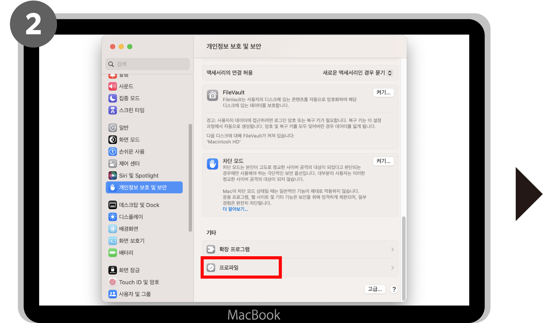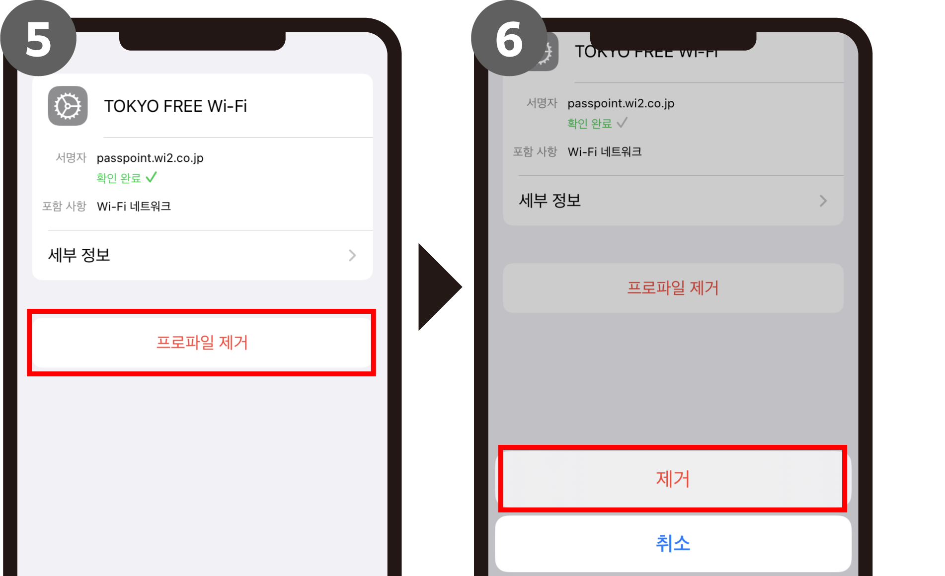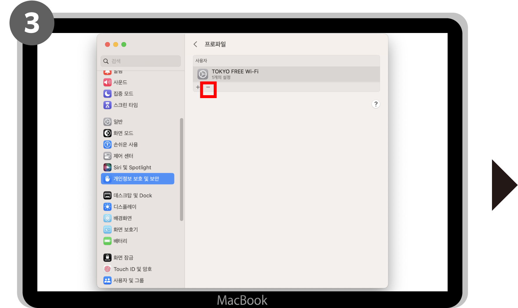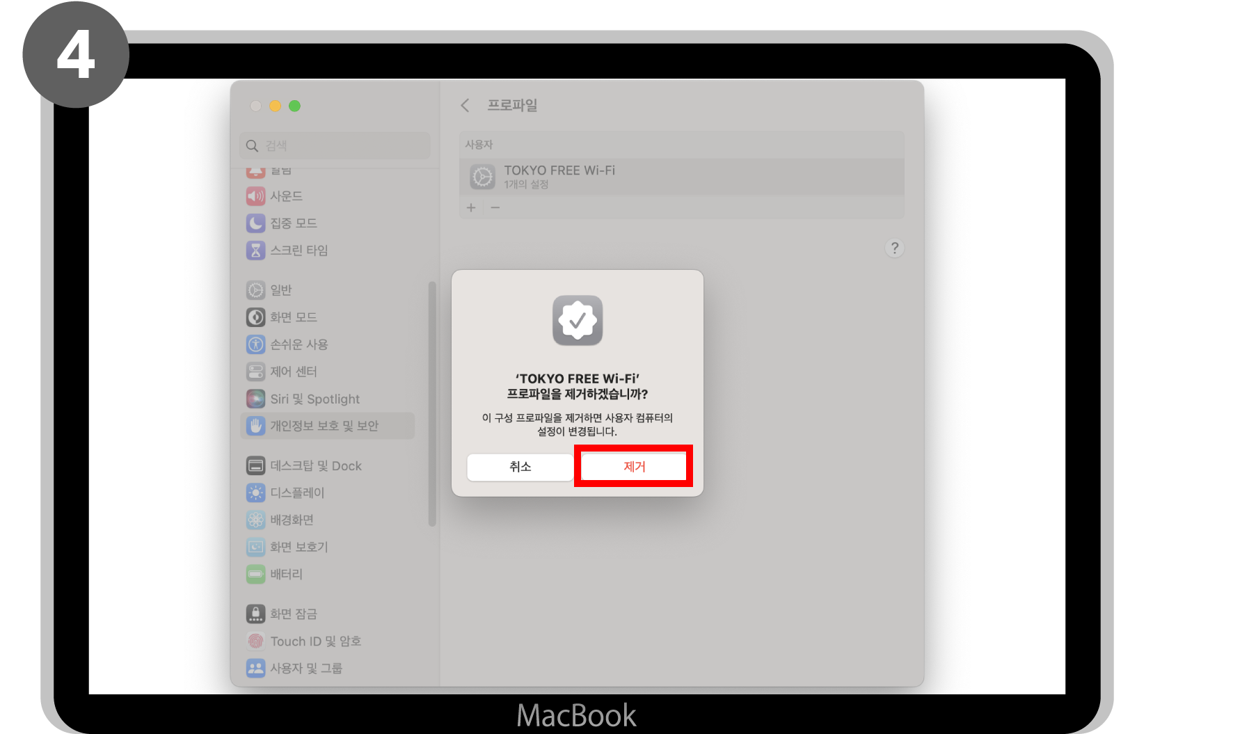 ‘시스템 설정’ > ‘개인정보보호 및 보안’ > ‘프로파일’ > ‘TOKYO FREE Wi-Fi’의 ‘-’를 클릭> ‘삭제’를 클릭하여 종료합니다.