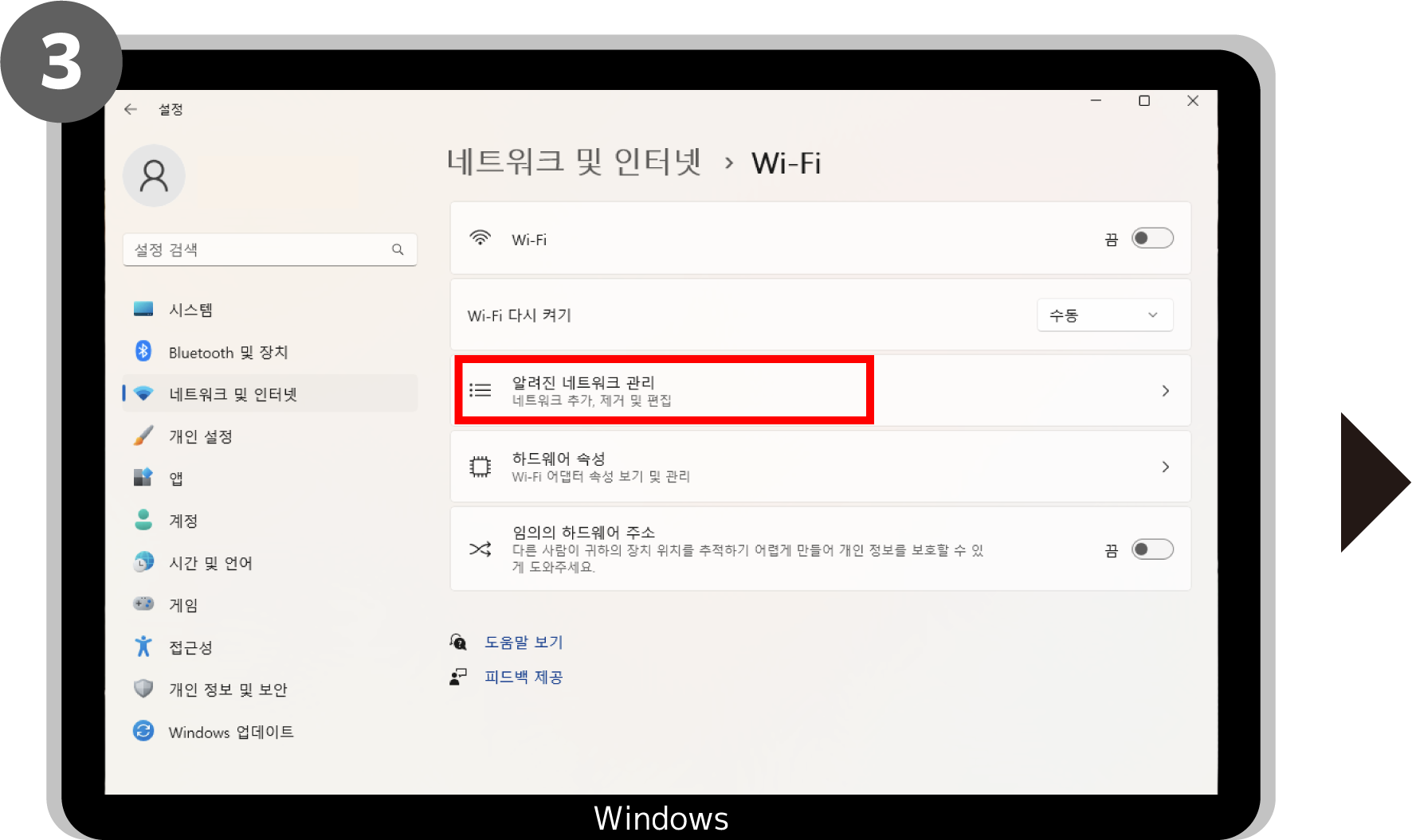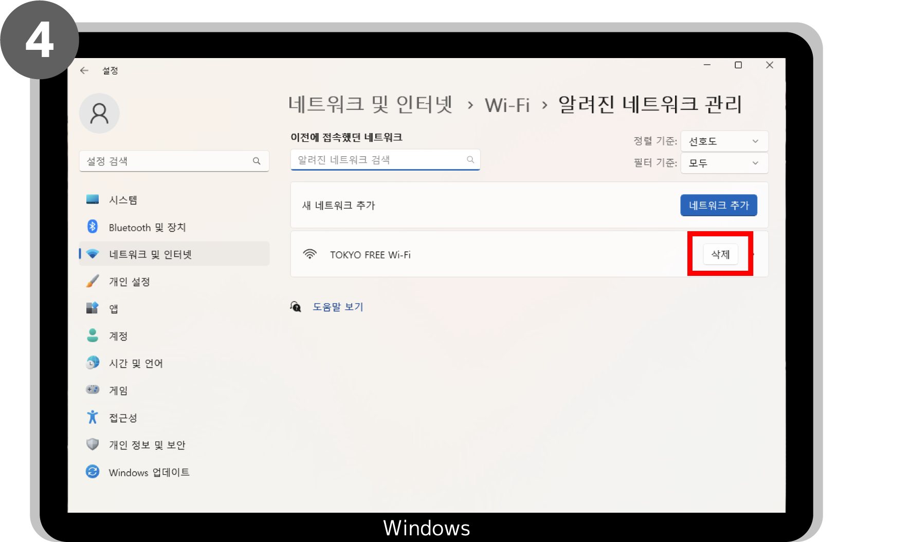 ‘시작’ > ‘설정’ > ‘네트워크 및 인터넷’ > ‘Wi-Fi’ > ‘알려진 네트워크 관리’ 또는 ‘Wi-Fi 설정 관리하기’ > ’TOKYO FREE Wi-Fi’ > ‘삭제’를 클릭하여 종료합니다.